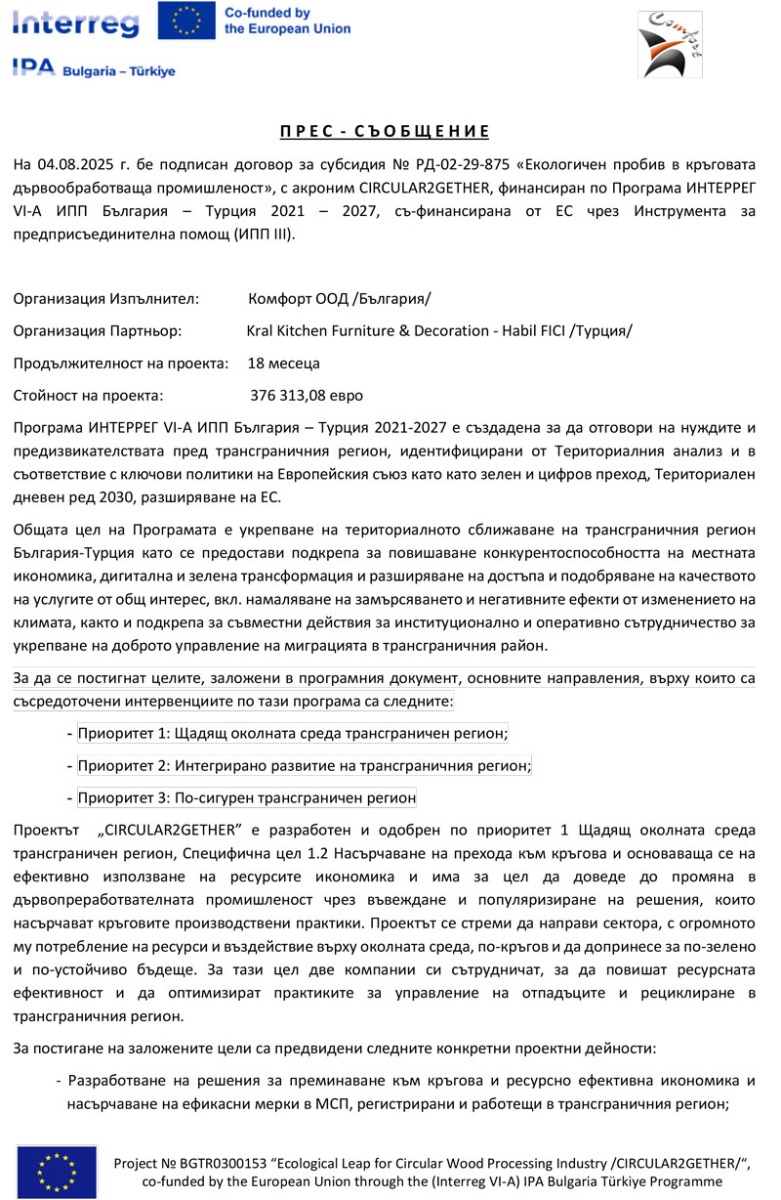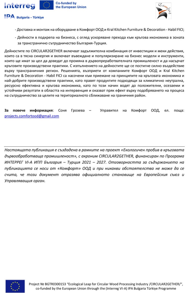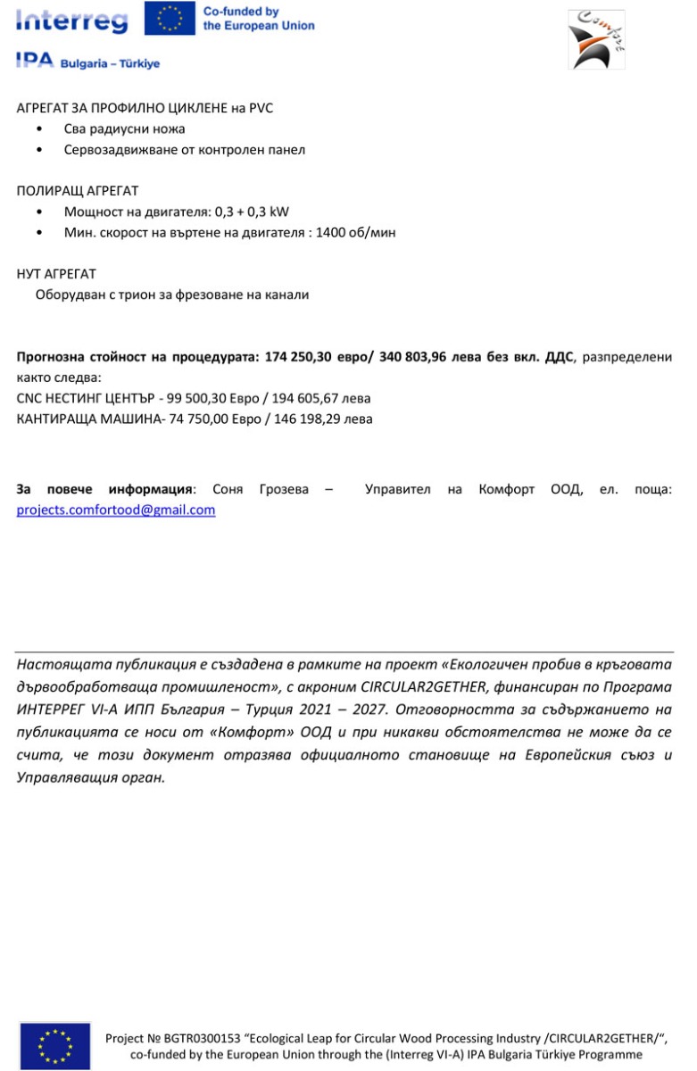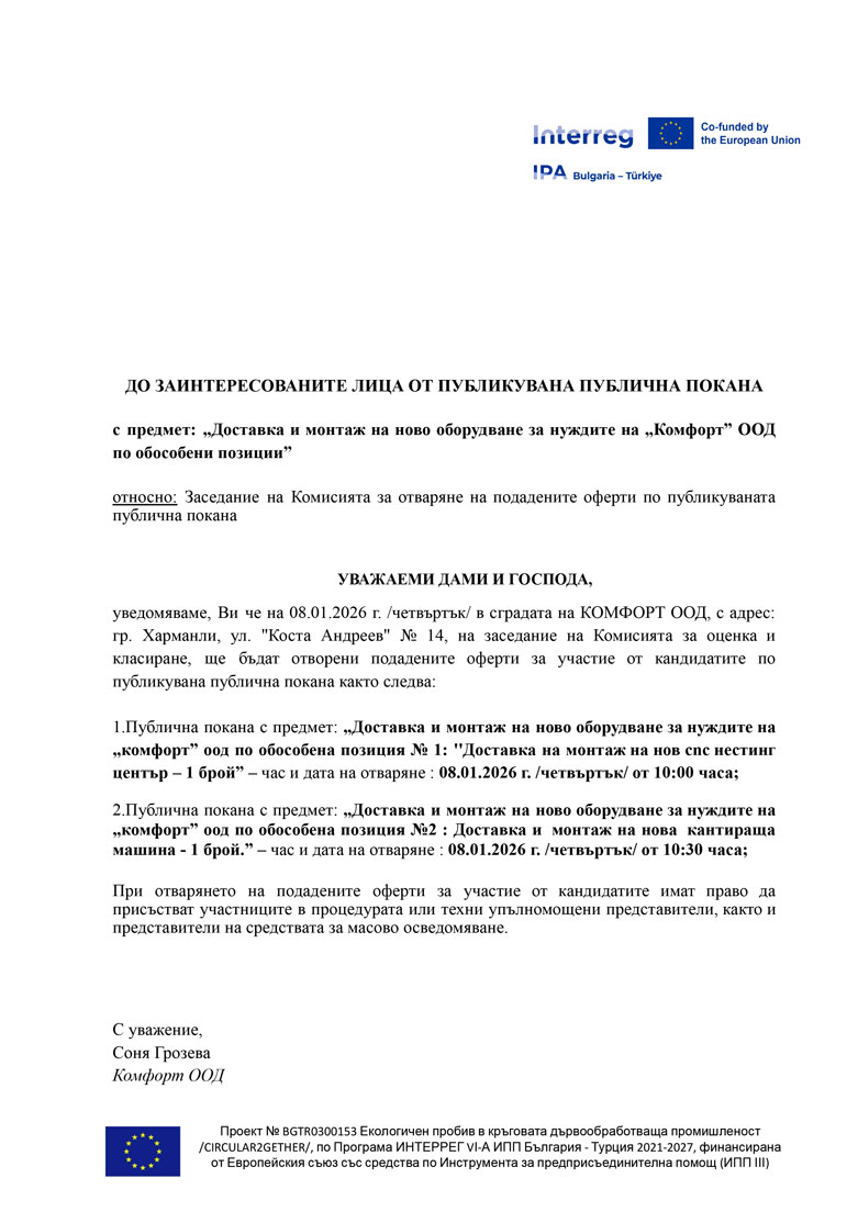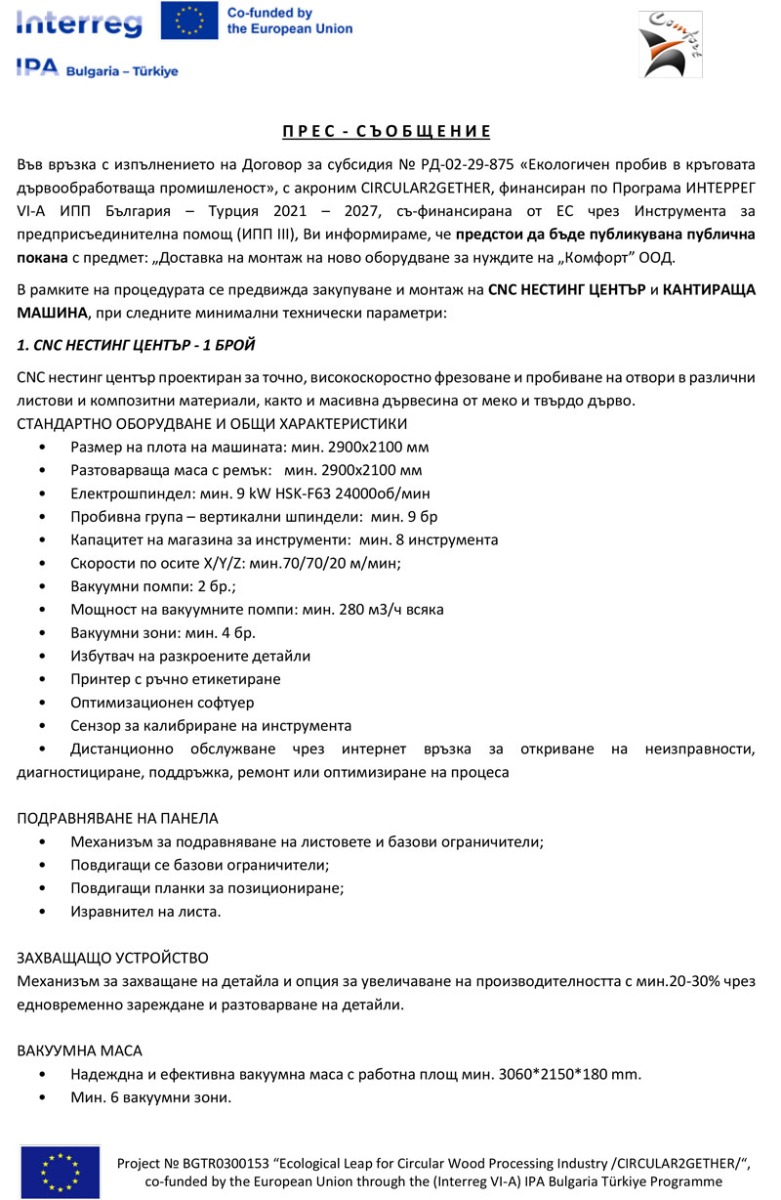 „Комфорт" ООД, бенефициент по проект №BGTR0300153 Екологичен пробив в кръговата дървообработваща промишленост /CIRCULAR2GETHER/, по Програма ИНТЕРРЕГ VІ-А ИПП България - Турция 2021-2027, обявява публична покана с предмет: „Доставка и монтаж на ново оборудване за нуждите на „Комфорт” ООД.