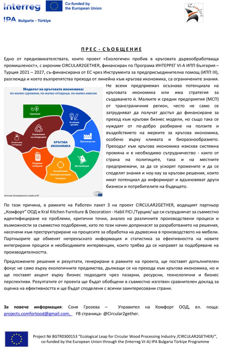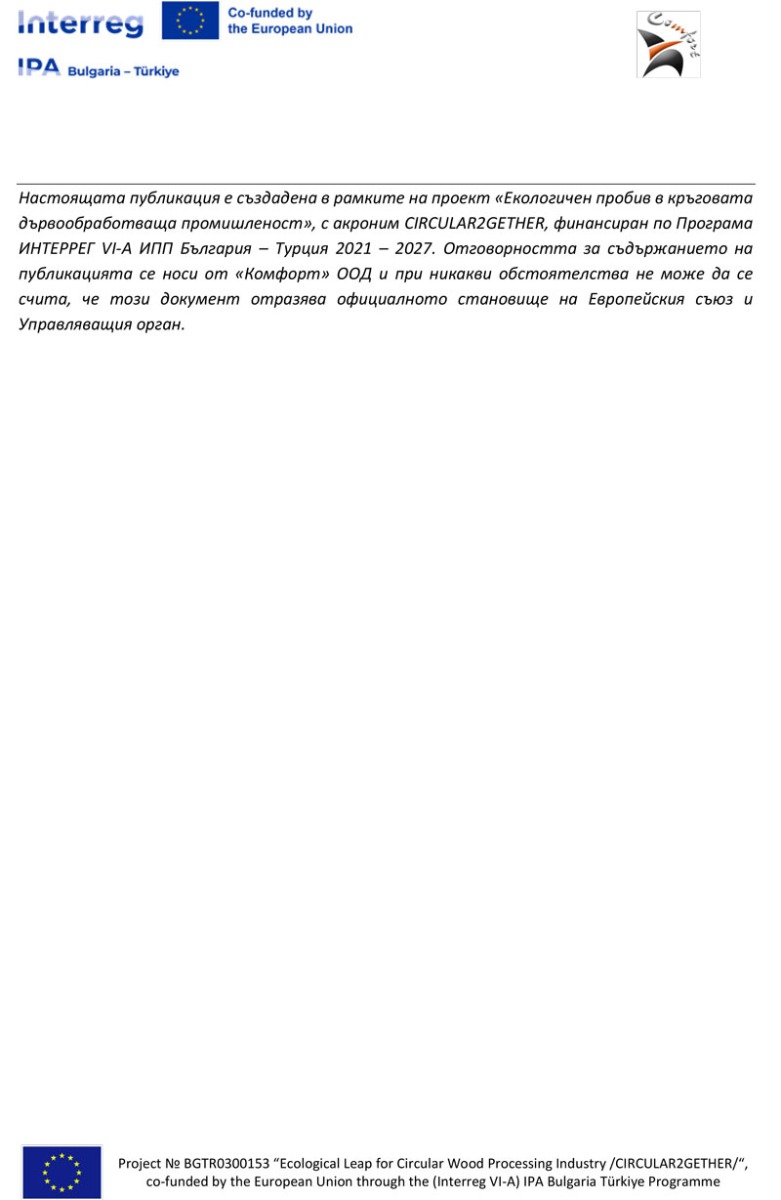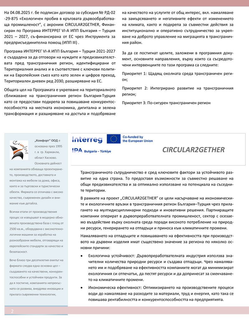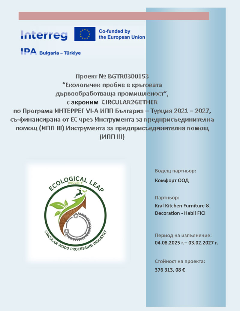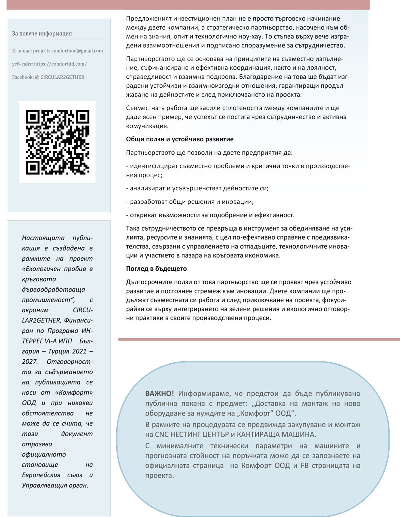 „Комфорт" ООД, бенефициент по проект №BGTR0300153 Екологичен пробив в кръговата дървообработваща промишленост /CIRCULAR2GETHER/, по Програма ИНТЕРРЕГ VІ-А ИПП България - Турция 2021-2027, обявява публична покана с предмет: „Доставка и монтаж на ново оборудване за нуждите на „Комфорт” ООД.