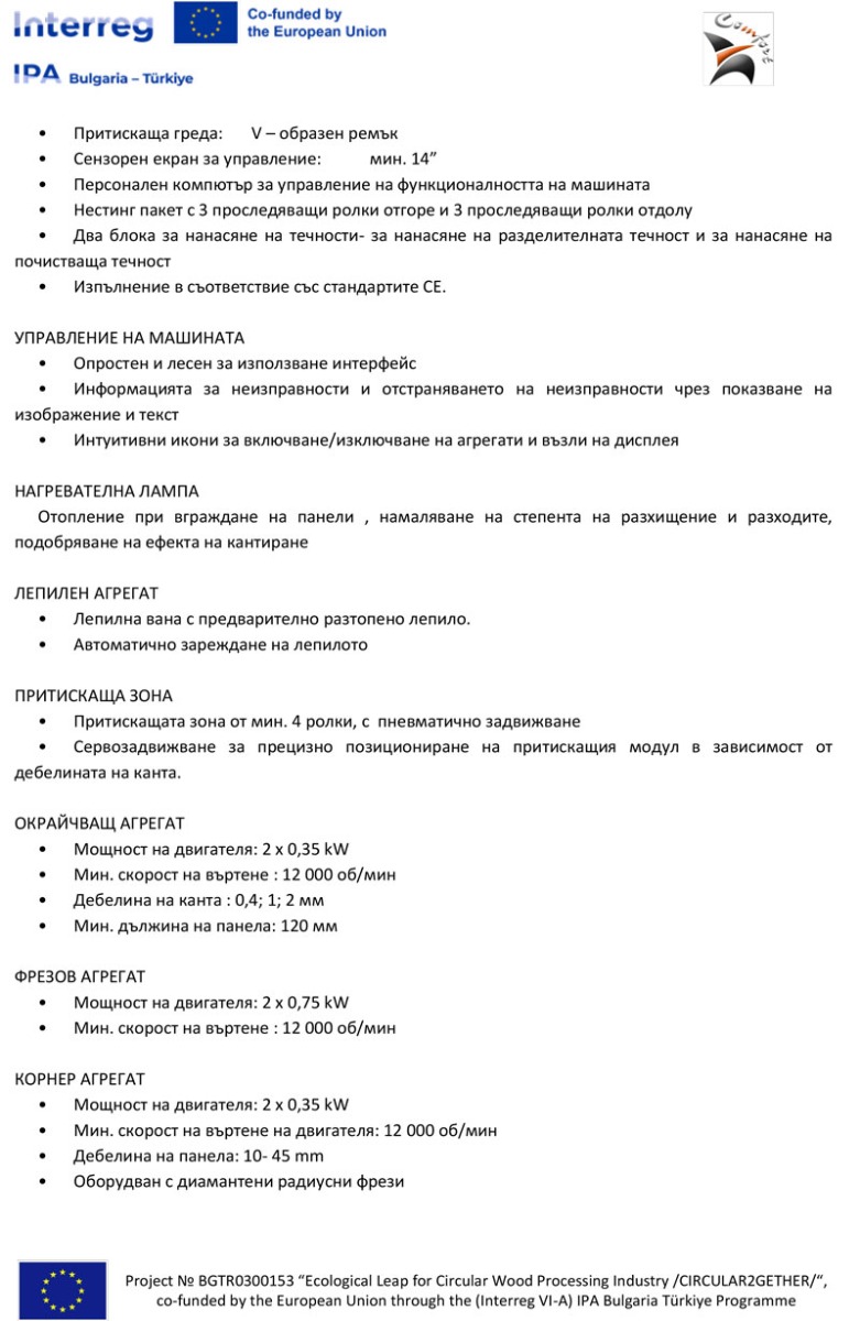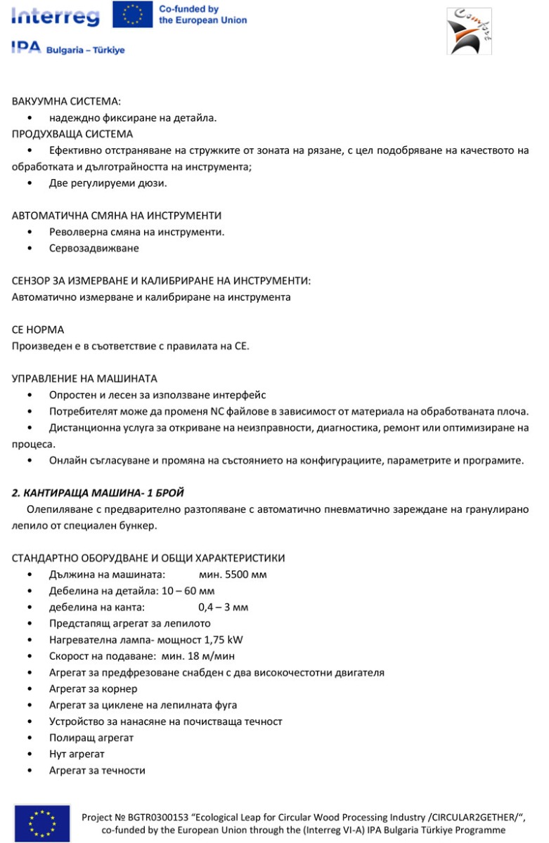 Описание на предмета на поръчката: Предметът на процедурата включва доставка, монтаж, провеждане на обучение за работа и въвеждане в експлоатация на оборудване, съгласно изискванията на Възложителя, във връзка с изпълнението на Проект № BGTR0300153 “Екологичен пробив в кръговата дървообработваща промишленост“ с акроним CIRCULAR2GETHER по Програма ИНТЕРРЕГ VІ-А ИПП България - Турция 2021-2027, финансирана от Европейския съюз със средства по Инструмента за предприсъединителна помощ (ИПП ІІІ), по две обособени позиции: